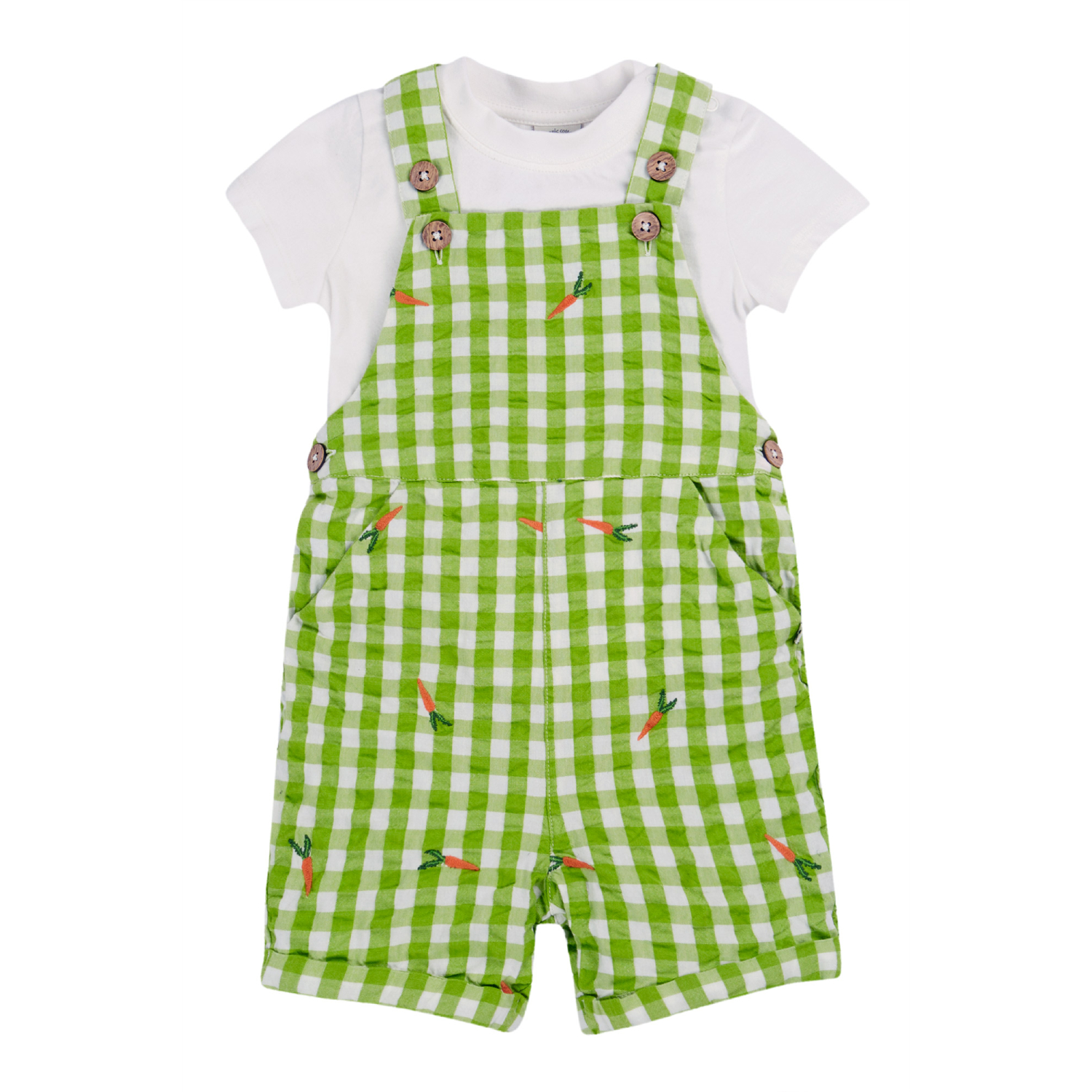 The Frugi Alfred Dungarees Outfit is a 2 piece outfit set with gingham seersucker dungaree and short sleeve body with side neck popper fastening. Dungarees shoulder straps are adjustable with button fastening.