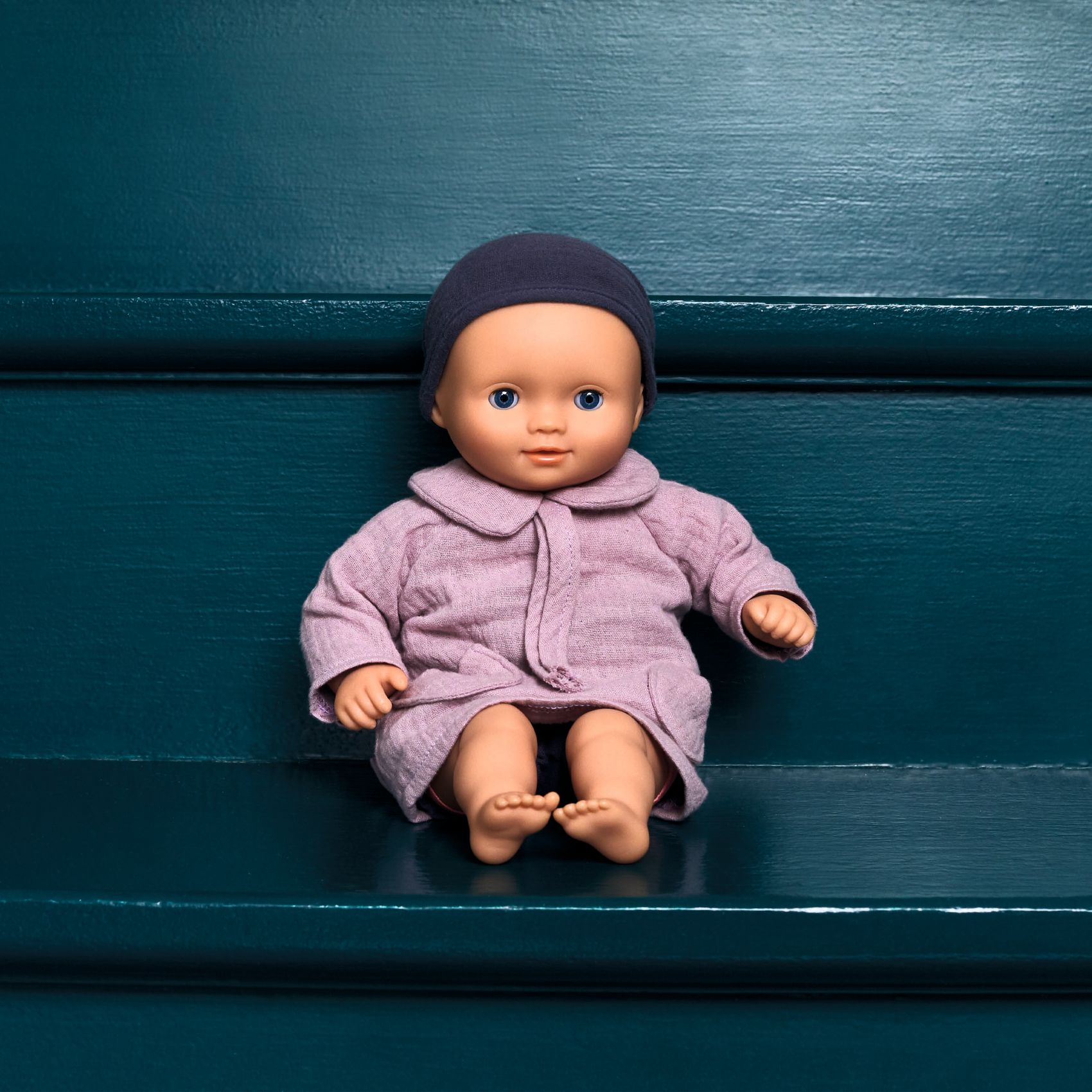 Baby Doll Dahlia Purple is a doll for children from 18 months, with big dark blue eyes and an angelic face. It is light and its size is perfectly suited to small arms. Its flexible body, printed with a bodysuit, allows it to be positioned like a real baby. Its face, arms and legs are made of very soft vinyl that is pleasant to the touch. Its sleepy eyes close when it is laid down on its back. This baby doll is dressed in a dress and a scarf on the head, made from a beautiful 100% cotton double-gauze material.