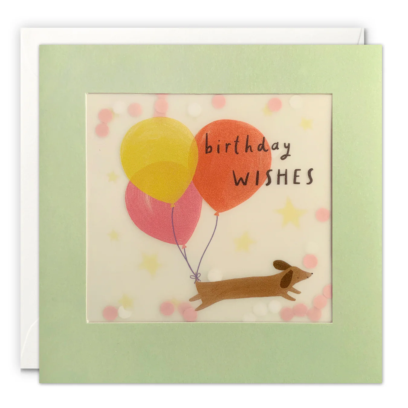• The image is printed on translucent paper, showing coloured confetti dots behind. The confetti moves around when you shake the card.