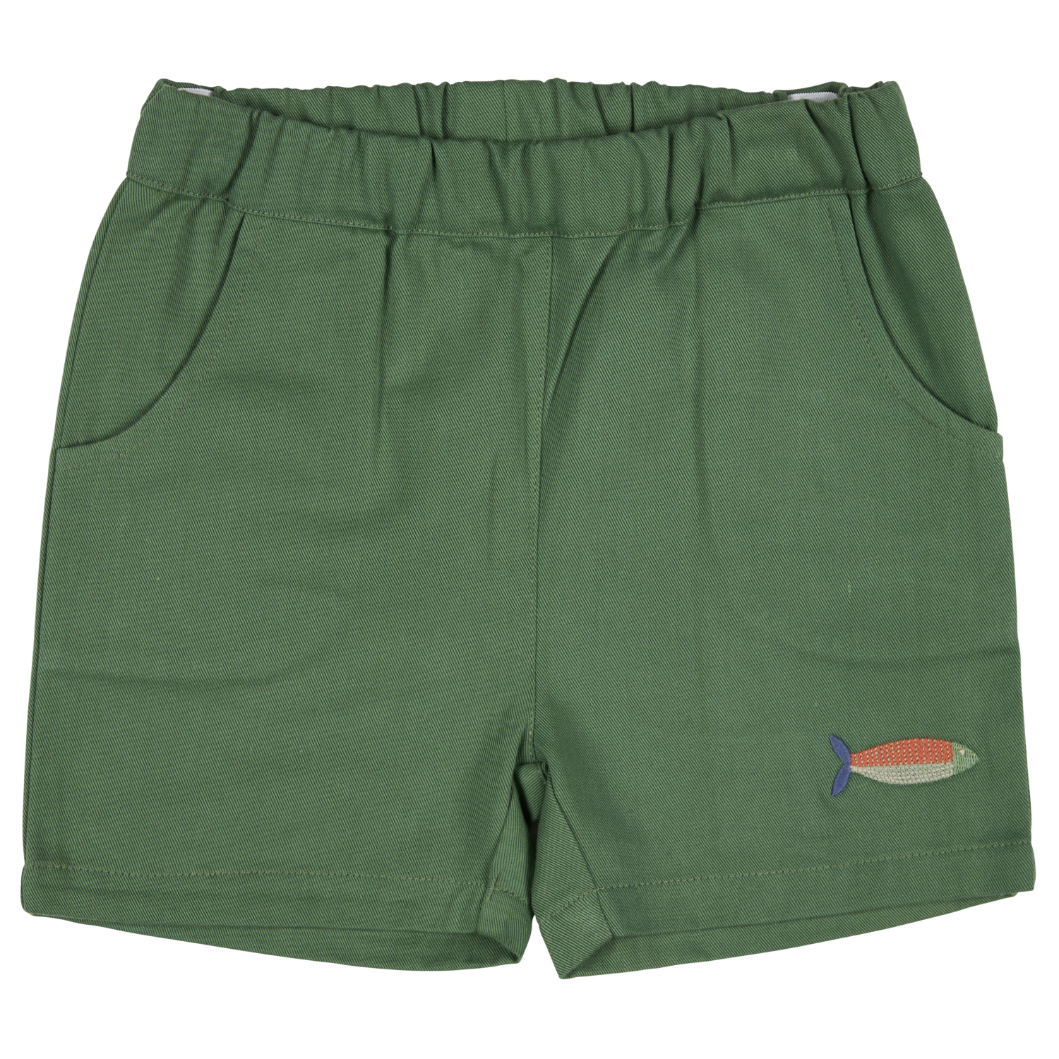 - Practical pull-on twill shorts with embroidered pocket detail on front and back, and adjustable elasticated waist.