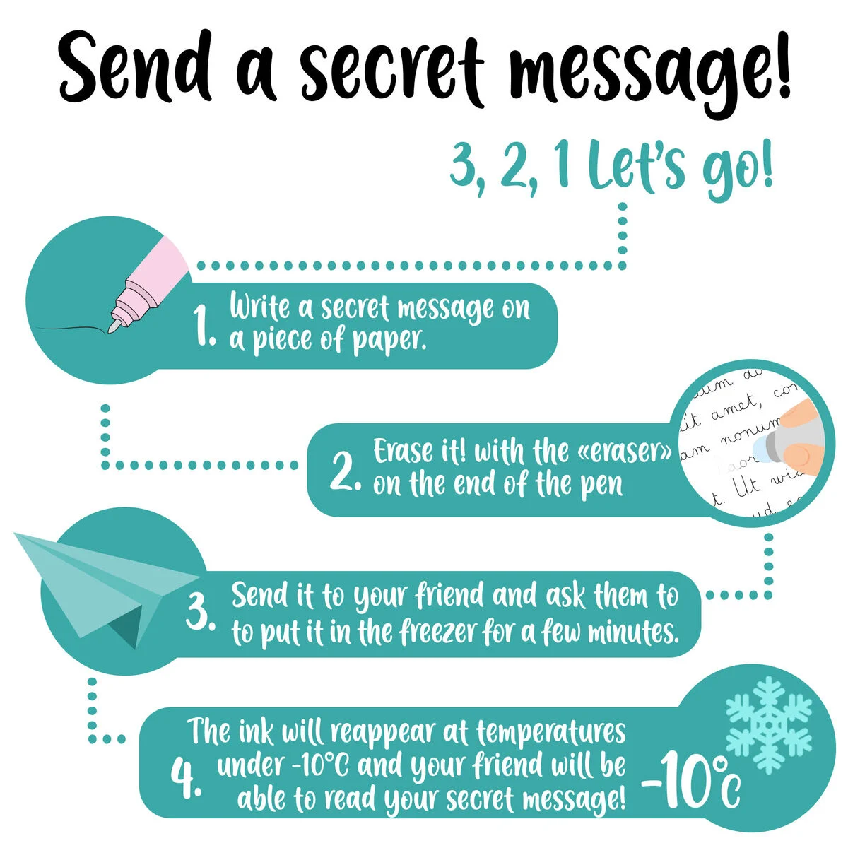 - Unicorn: Pink ink, ‘Believe in Magic” written on the pen