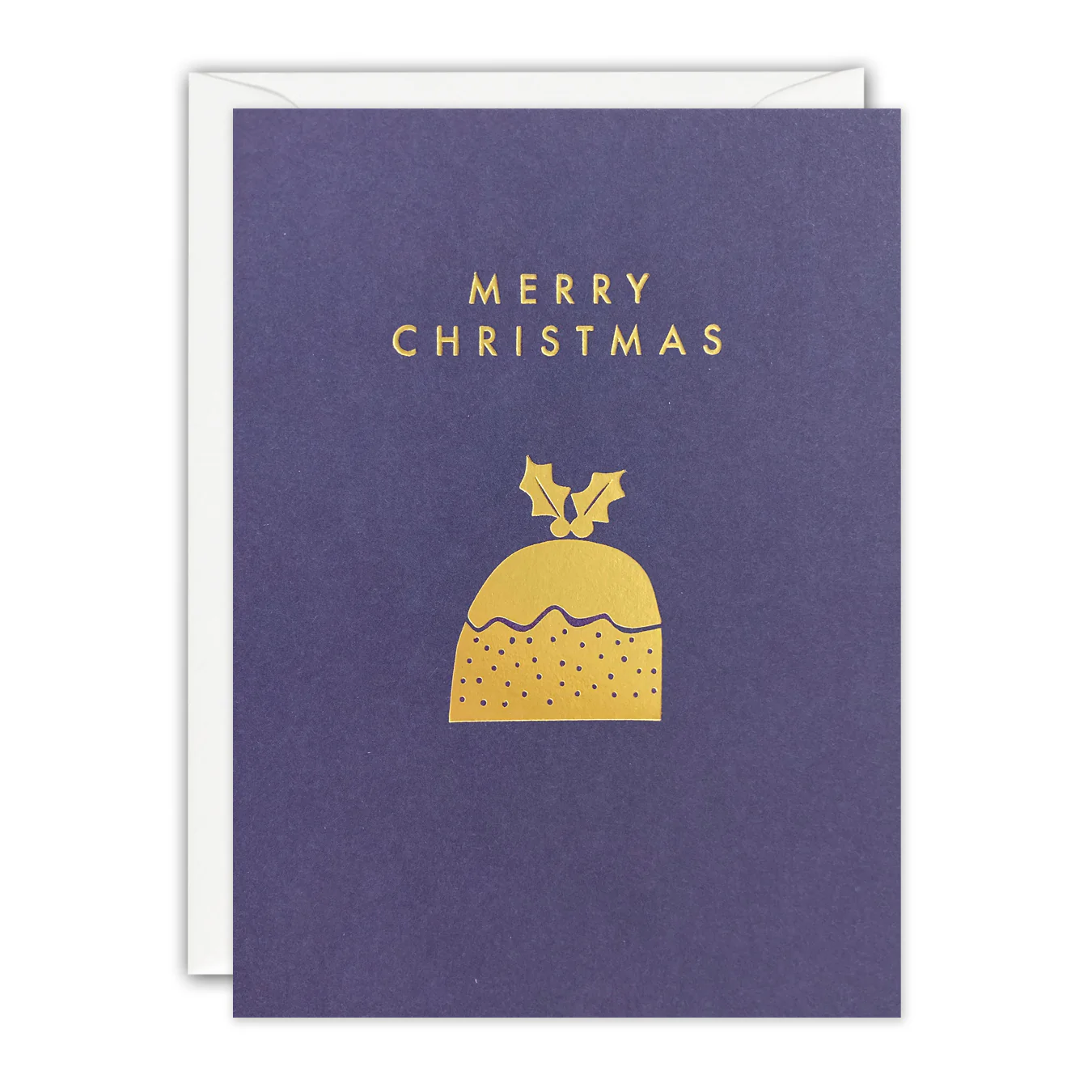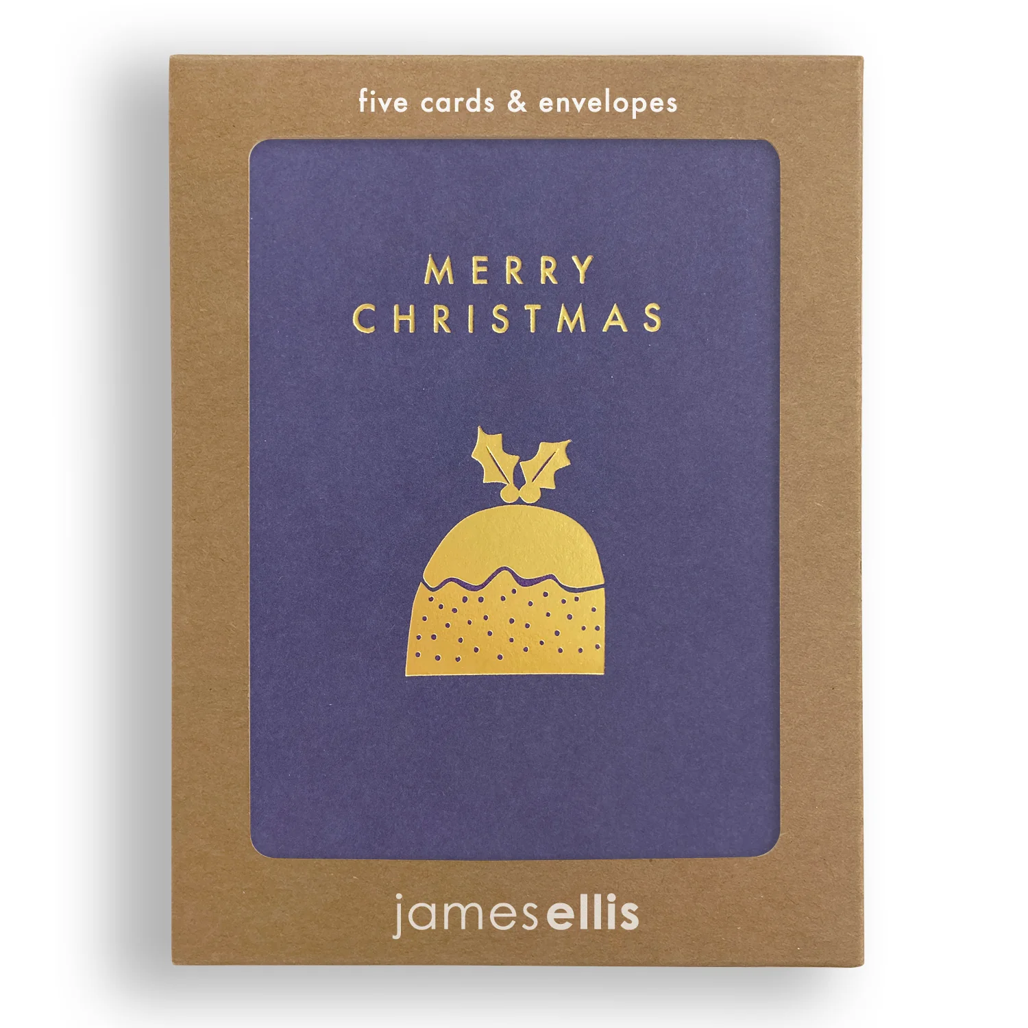 A box of five mini Christmas cards illustrated by Linda Tordoff. The image on the front of the cards features a gold foiled Christmas pudding on a purple background and the text ‘Merry Christmas”.