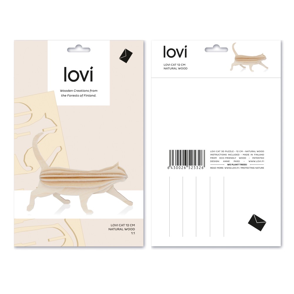 The products are 100% made in Finland and made from the highest Finnish quality, PEFC -certified birch plywood. The products are assembled by hands without any tools. The cat is packed in a paper envelope size easy to send. Slotting cleverly together the beautiful Lovi shapes provide a sense of wonder as they take shape and come alive. All with the added, satisfaction of working with your hands