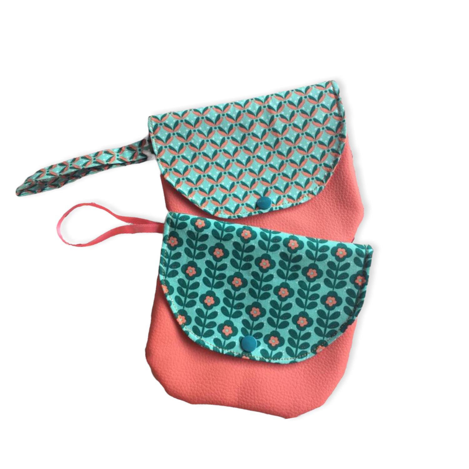Coated pink material with contrasting printed cotton teal and pink flap, and a plastic stud.